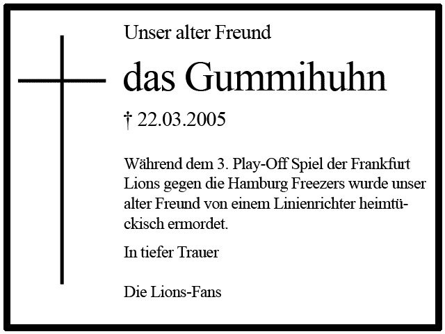 Wer ein Gummihuhn sieht, der denkt sofort an das Frankfurter Eishockey. Seit mehreren Jahrzehnten ist es nun schon fester Teil unserer Geschichte und drückt unsere Unzufriedenheit mit einer Schiedsrichterentscheidung aus. Wurde das Gummihuhn eingesammelt, so forderten wir Jahr für Jahr „Freiheit fürs Gummihuhn“. In den letzten Monaten zeigte sich aber, dass das Gummihuhn wohl so viel Freiheit hatte, dass es sich überhaupt nicht mehr in der heimischen NIX-Eissporthalle blicken ließ – dabei wäre es in den letzten Wochen doch einige Male angebracht gewesen…