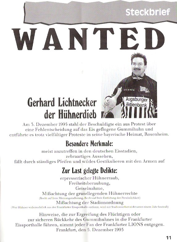 Auch das Geheimnis der Hühner-Rückführung ist zwischenzeitlich gelüftet. Am 26.12.1995 beim Spiel der Lions in Krefeld gab Gerhard Lichtnecker das Gummihuhn reumütig zurück an seine Frankfurter Besitzer. Als Entschuldigung warf er darüber hinaus auch noch kleine Gummihühner als “Nachzucht” in den Frankfurter Fanblock. Ein Dank geht an Bernd – bzw. seine Frau – für den Fang eines dieser seltenen und signierten Exemplare (siehe Fotos).